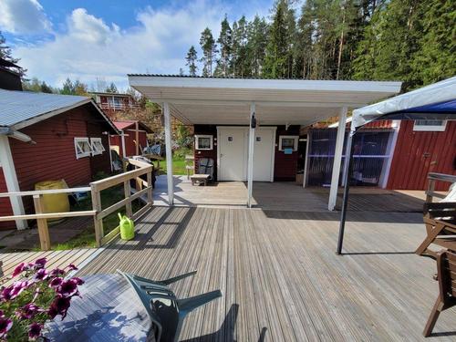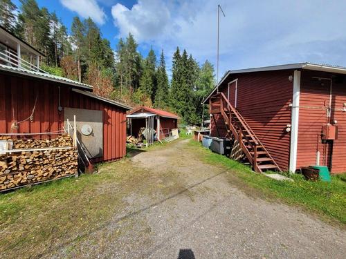 Kesäkodin puulämmitteinen sauna onkin vertaansa vailla ja sijaitsee vain muutaman metrin päästä järvestä. Saunomisen ja uimisen ohessa voi grillailla katetussa grillipaikassamme. Grillipaikka on kuvassa aivan vasemmaisena. Kuvassa laiturin edessä on rakennus, jossa on tupa vasemmalla, keittiö keskellä ja sauna matalamman osan oikealla puolen.